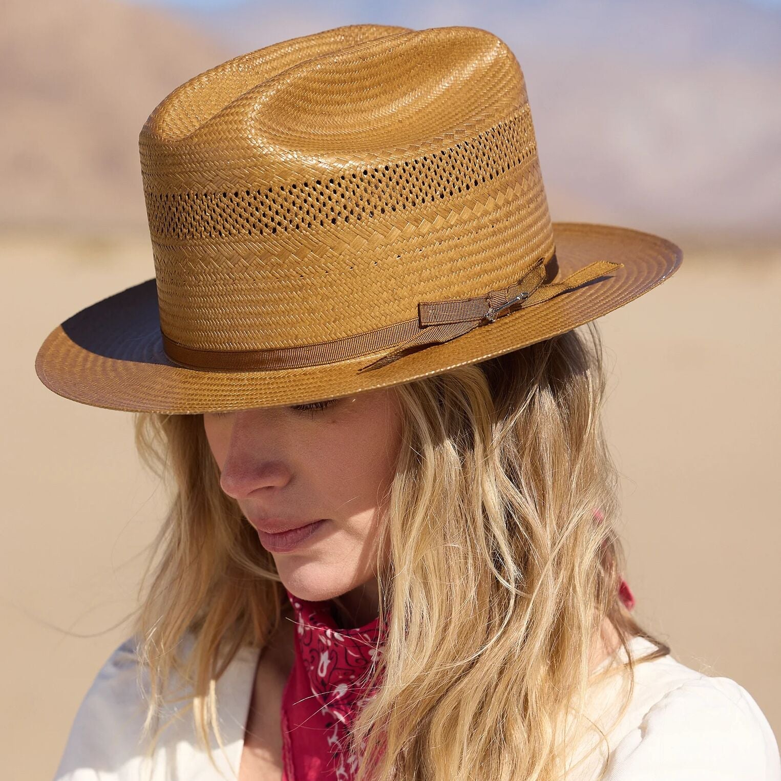 The Open Road Straw features a genuine leather sweatband and a 4 ?" crown outfitted with a satin hat band.