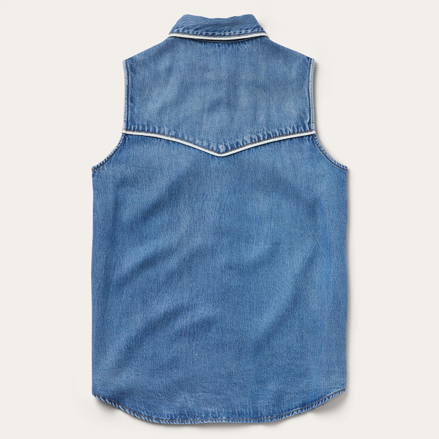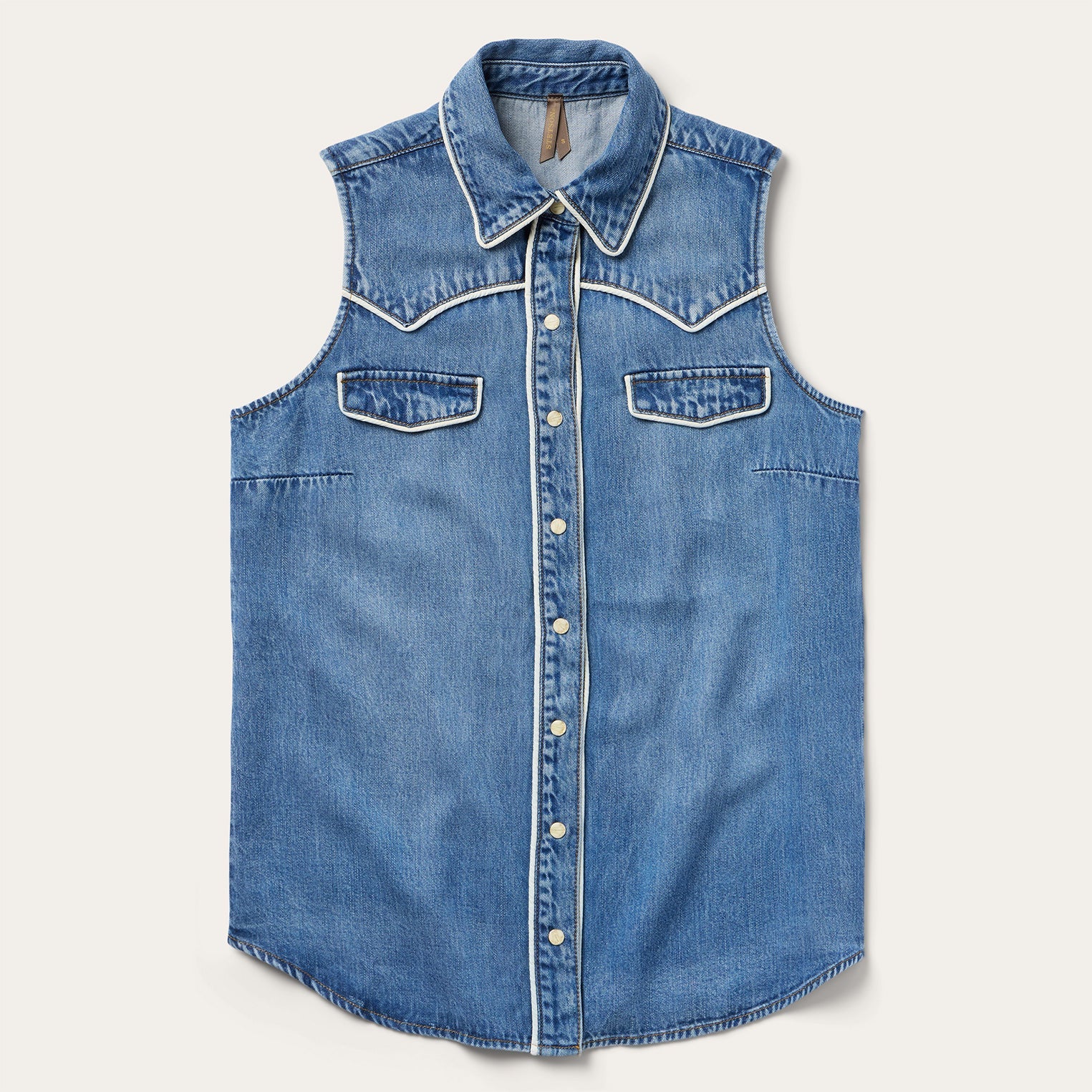 This stylish sleeveless shirt is crafted from high-quality 100% lyocell denim. It has a retro western-inspired style with single point curved front yoke, straight back yoke, front faux pocket flaps and cream contrast piping, along with a full snap front.