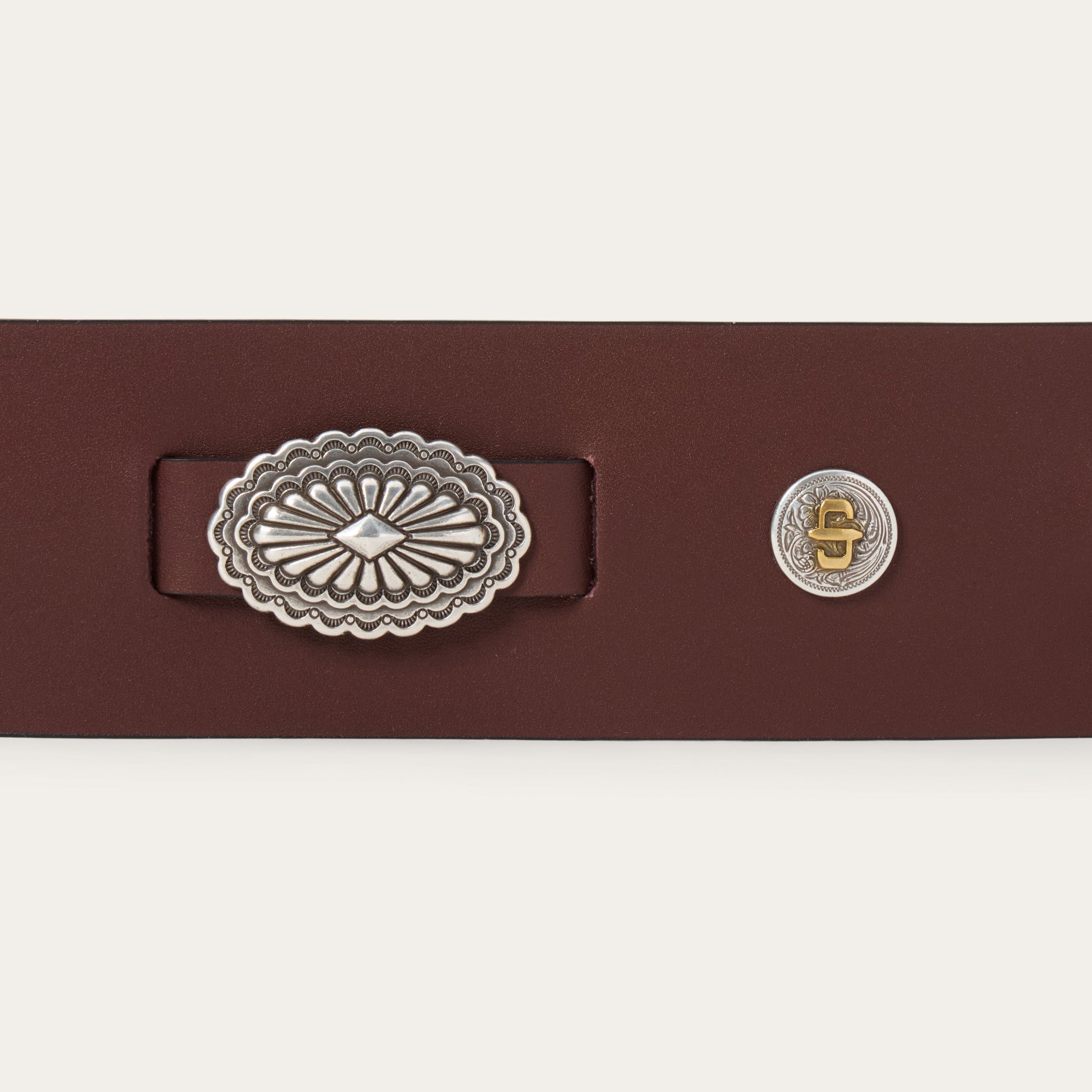 Made from top grain leather, this Southwestern concho belt has a 2 3/8" wide brown leather strap with silver-tone oval southwestern conchos and round logo conchos. It features five holes on the point end to ensure a proper fit for all body types and is finished with an oval plaque silver-tone buckle. Our belts embody our legendary commitment to quality and make the perfect complement to your favorite hat and boots.