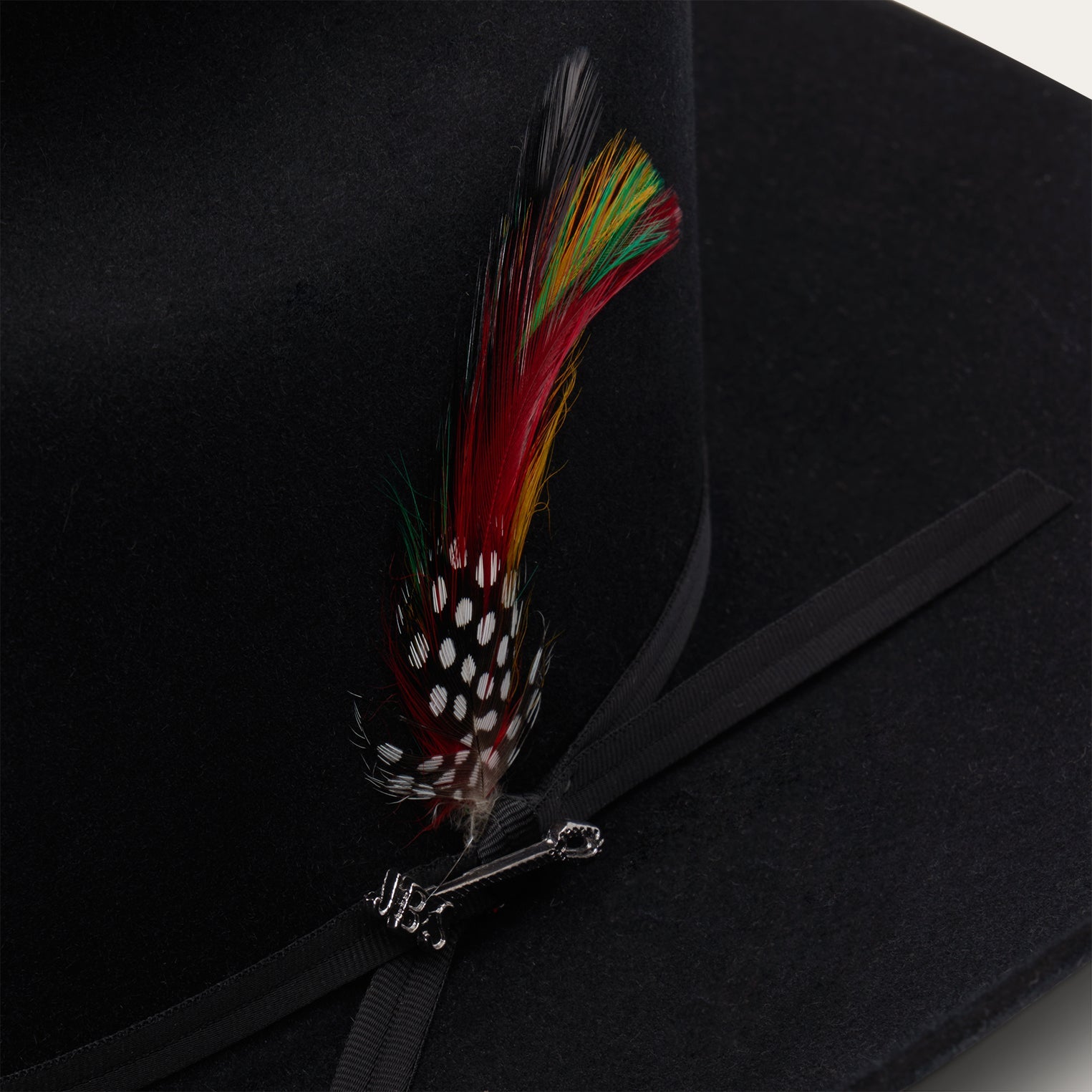 The Spartan 6X cowboy hat is crafted from 6X quality fur felt. Its authentic Western profile features a 4 5/8" cattleman crown and 4" brim complimented by a two-ply ribbon hat band with feather detail, and JBS brand pin. A genuine leather sweatband and full satin liner provide all-day comfort and a superior fit. Handmade in the USA, with quality and style that will stand the test of time, the Spartan 6X ships with a It hat box.