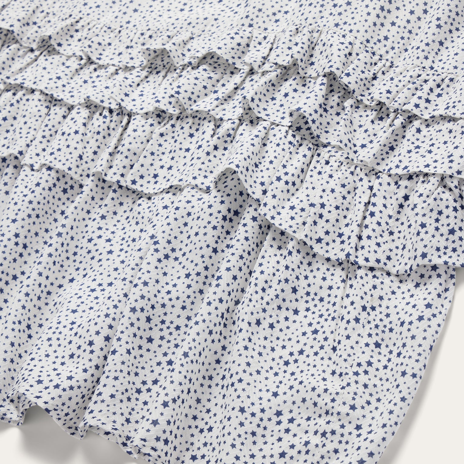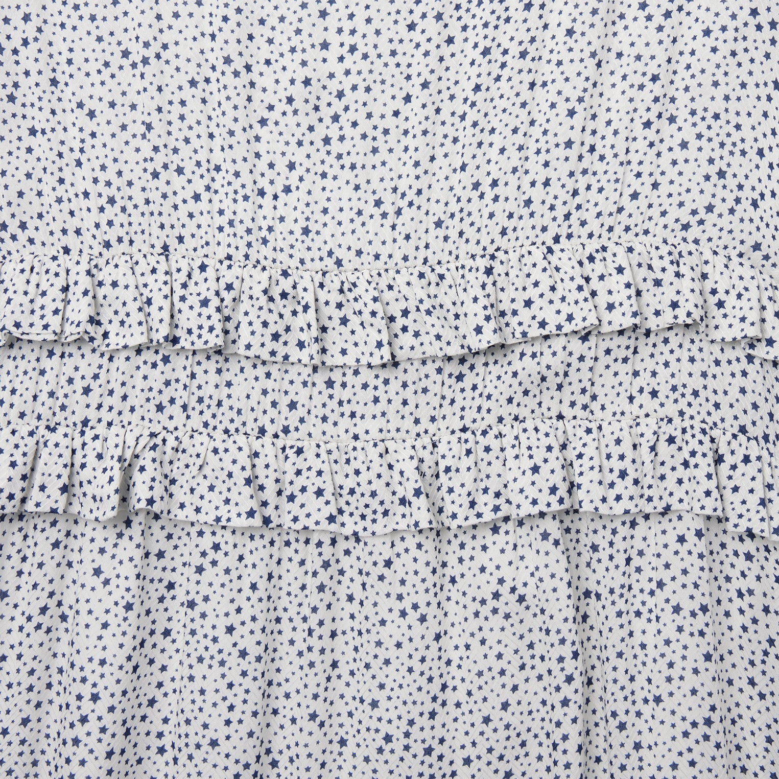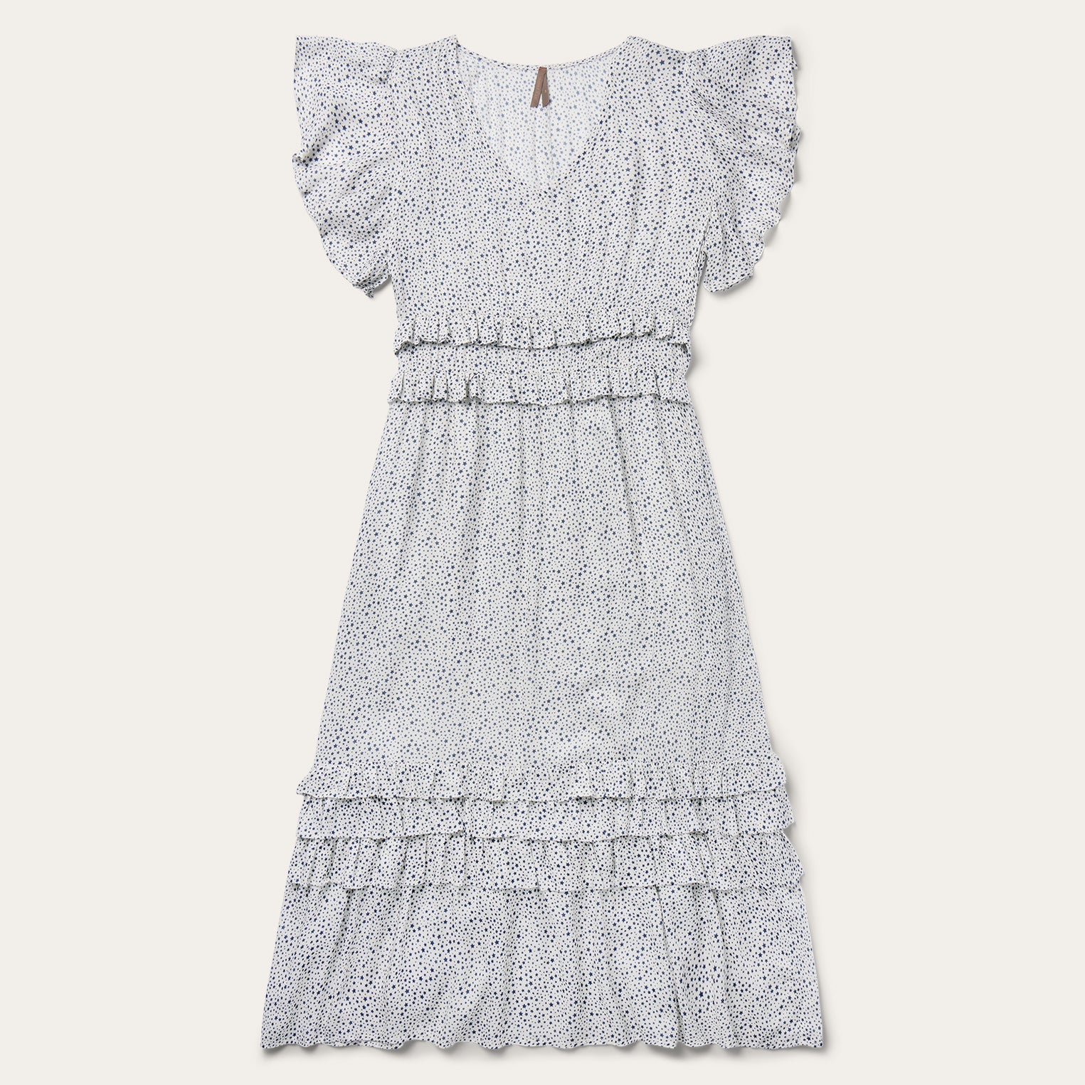 This short-sleeved dress features an exclusive Stars print and is crafted from soft, stylish rayon herringbone. It has flutter ruffle sleeves with gathers, and elastic waist with two rows of ruffles and four rows of tiered ruffles at the bottom of the skirt. Additional details include side seam pockets and zip closure. Cut with an easy, flattering drape, the dress allows for all-day comfort and freedom of movement.