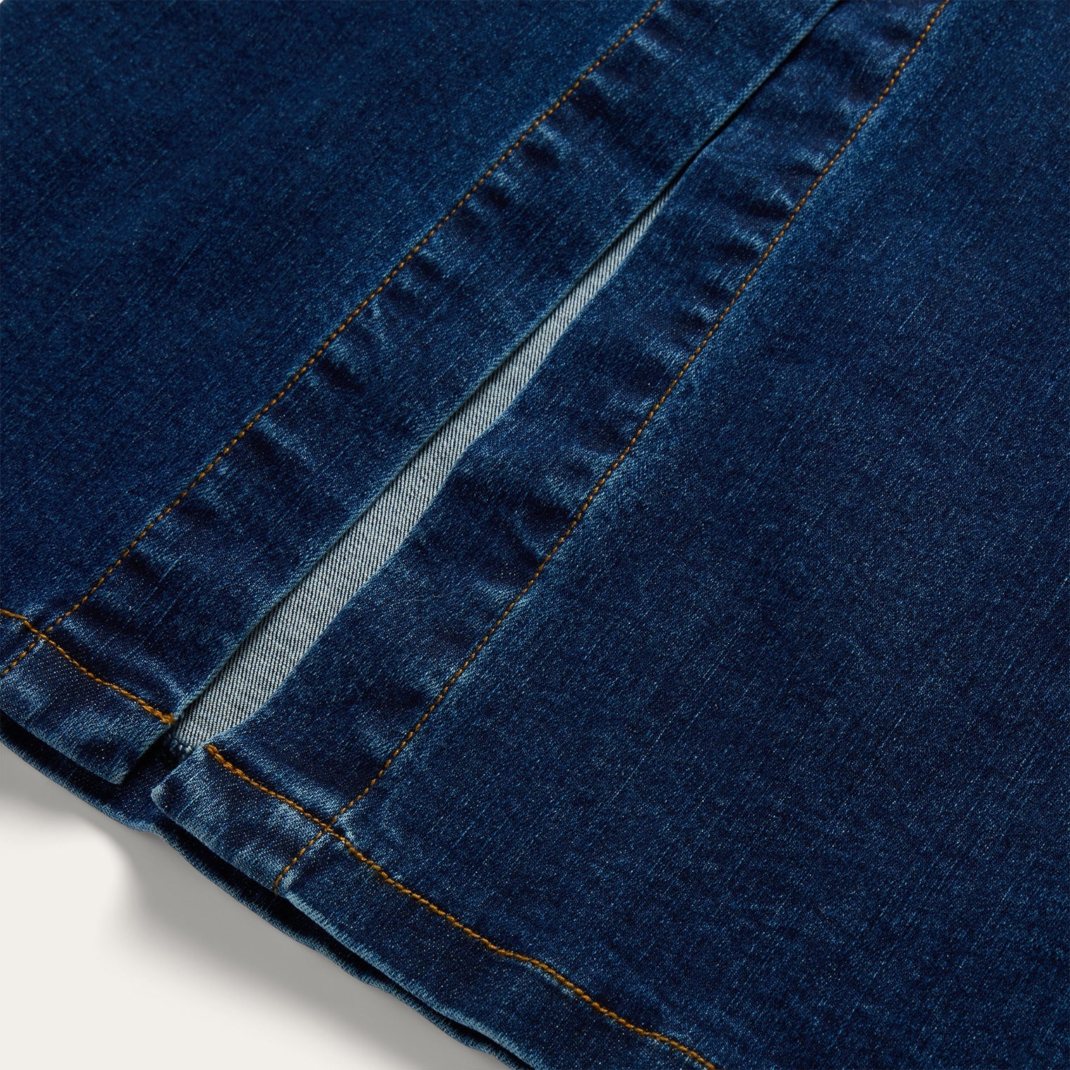 This full-length form-fitting dress is crafted from high-quality cotton denim with just a hint of stretch to allow for freedom of movement. It features thin straps, front and back darts below the waist seam, zipper closure at center back and a center back vented slit.
