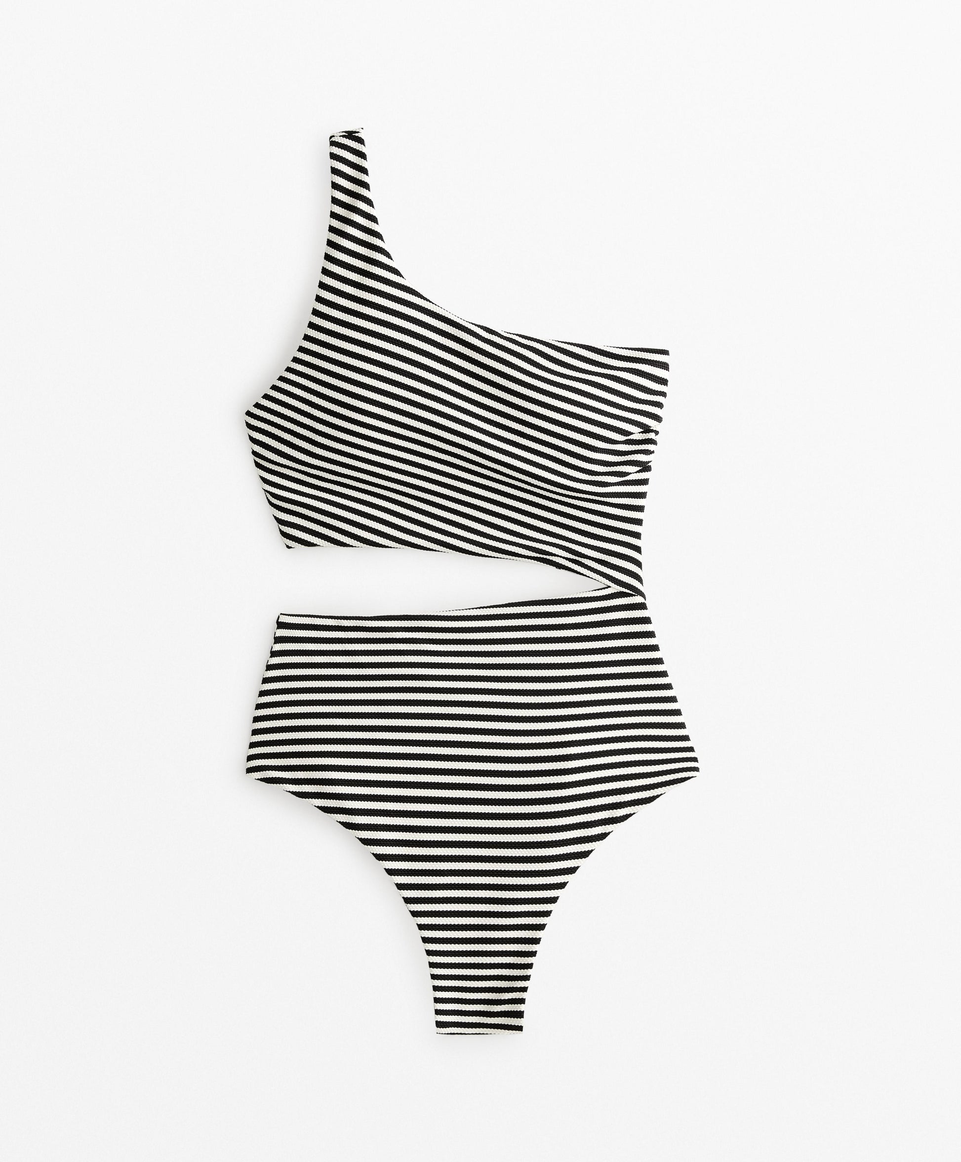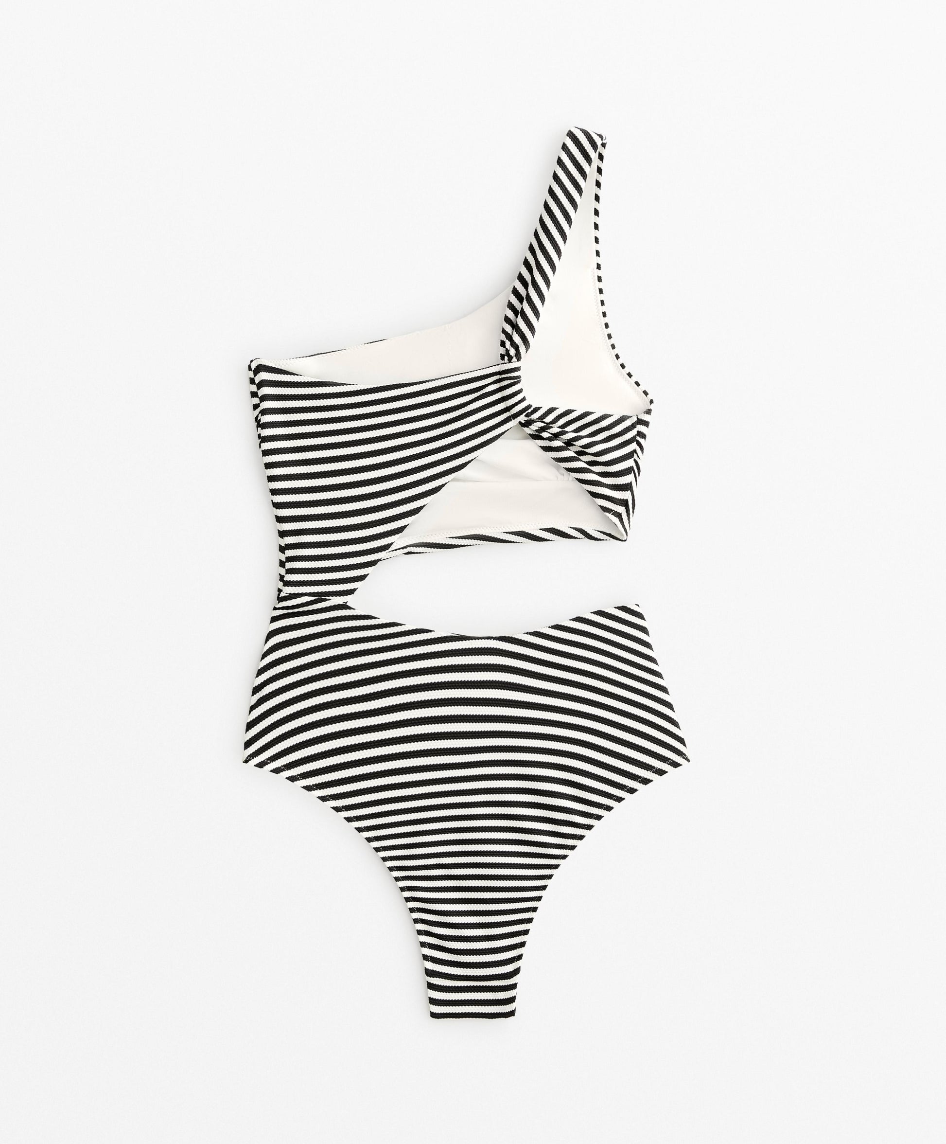 Ref. 0744/729/800 Non-wired trikini with asymmetric neckline and removable cups. Cut-out details at the back and waist. Bubble textured fabric with contrast stripe detail.Materials and care instructions