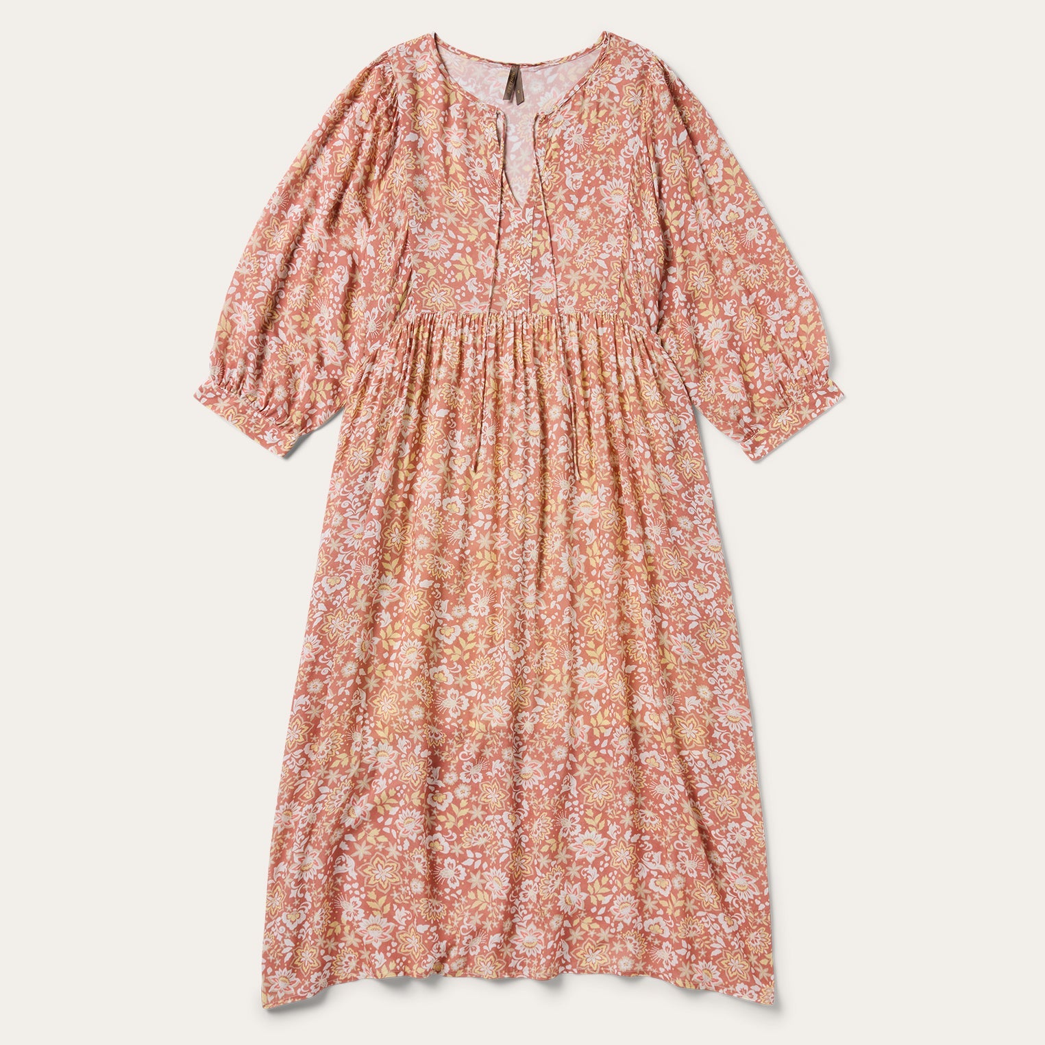 This vibrant dress is crafted from soft 100% rayon and features our exclusive Sunset Floral print. It has oversized elbow-length raglan sleeves with open cuffs, a front bib placket with self tie keyhole closure, back bodice seaming and a gathered skirt. Cut with an easy, flattering drape, the dress allows for all-day comfort and freedom of movement.