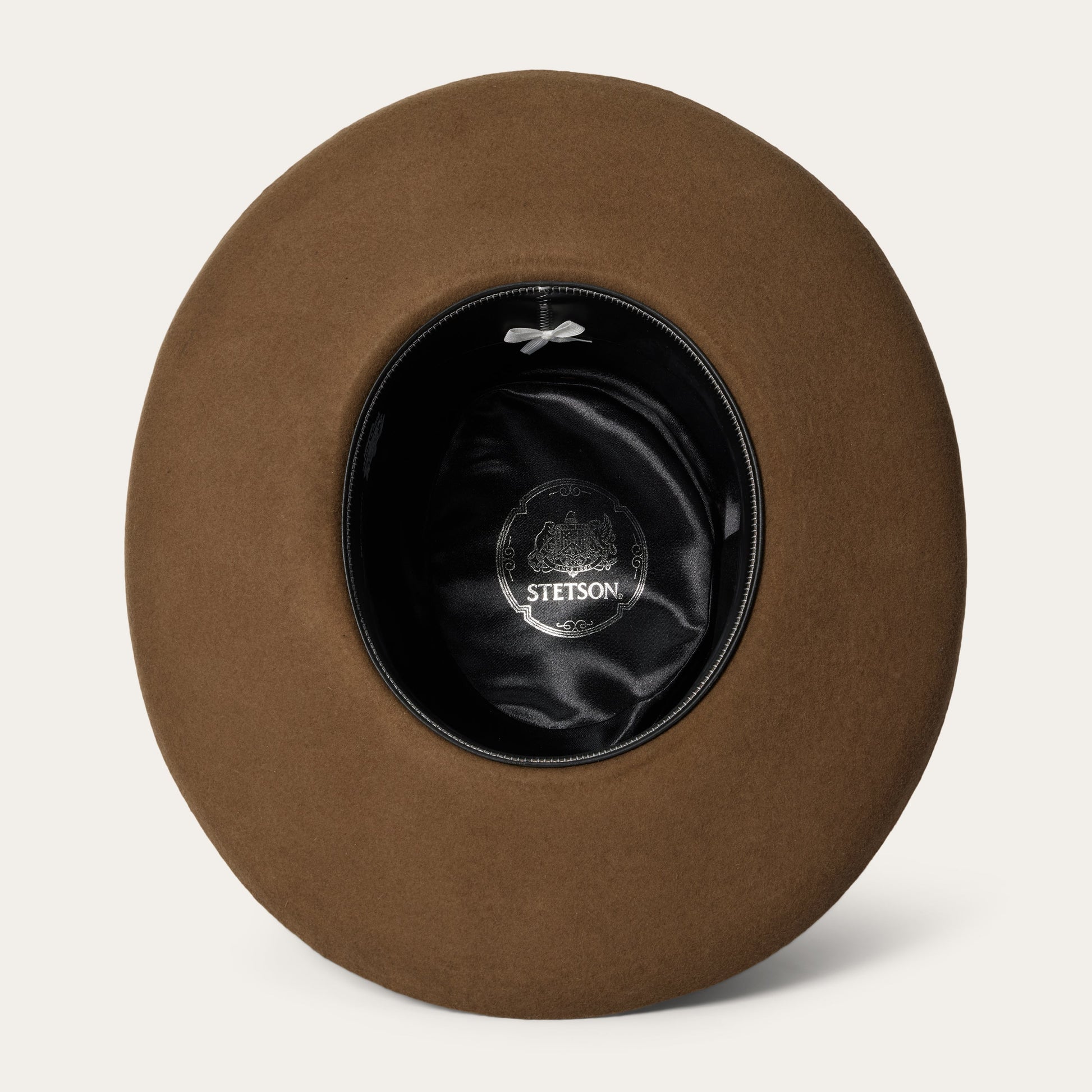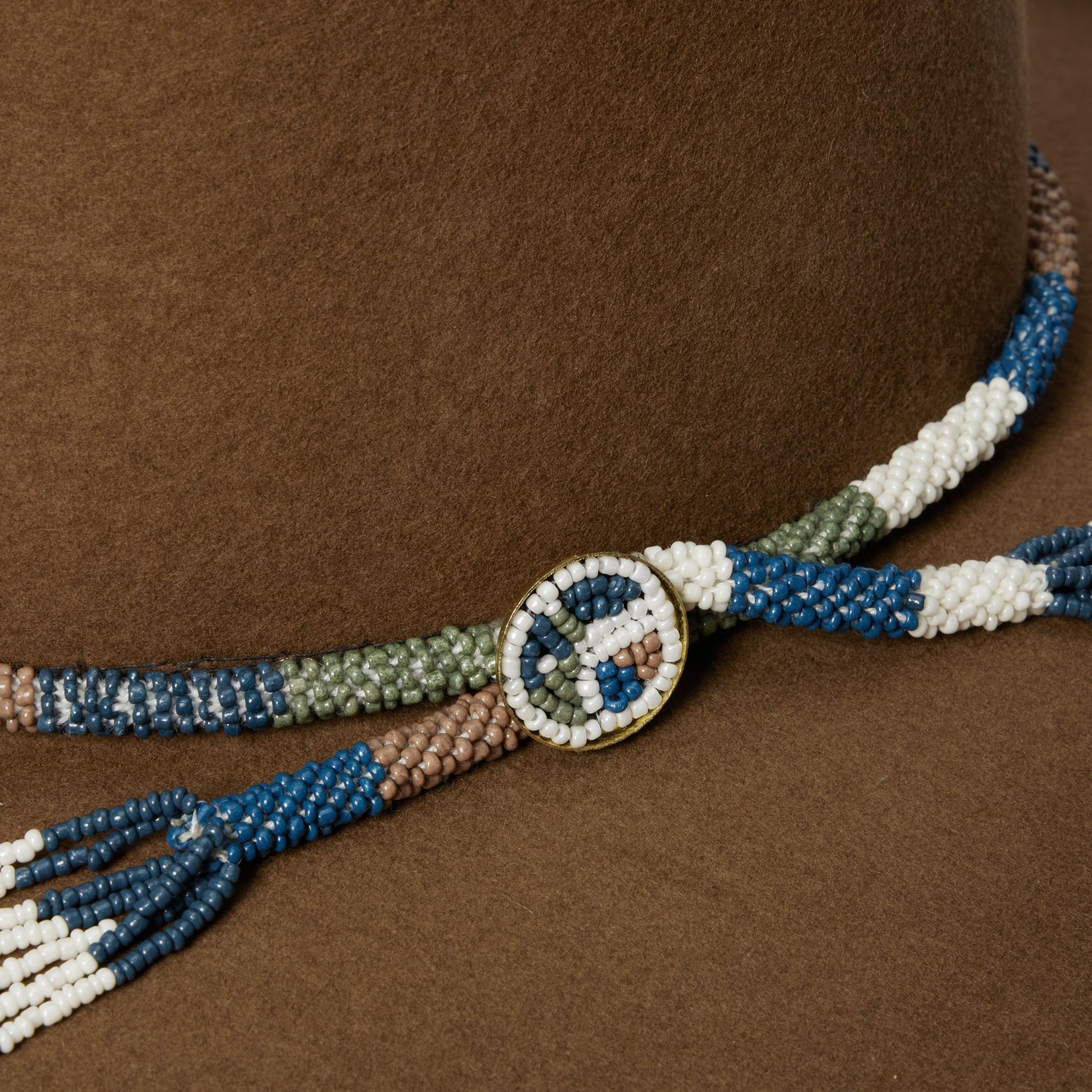 The Tellus is a western-inspired fashion hat with a bold silhouette and eye-catching details that make a statement wherever you go. Handmade in the U.S.A. with a firm finish from high-quality 100% wool felt, it features a 3 3/4" gambler crown and a 4 1/8" curled raw edge brim. It's finished with a hand-beaded hat band and concho, a beaded side pin, a faux leather sweatband and satin liner.
