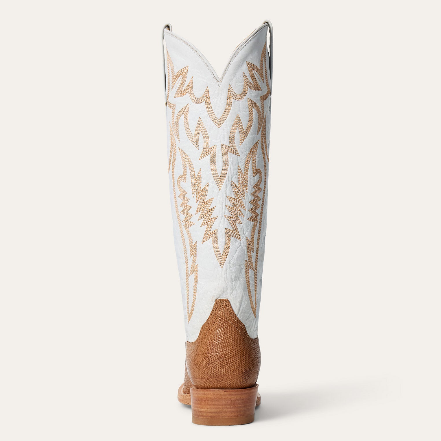 A statement-making western boot with elevated style, the Toni Boot features a full teju lizard vamp known for its distinctive scale pattern and subtle sheen. It's paired with a 15" goat leather shaft embroidered with a unique stitch pattern, and finished with a stylish snip toe and hand-stacked leather heel. An all-leather sole, crafted with lemonwood pegs and brass nails, provides a firm foundation, while premium cowhide leather lining and a cushioned insole ensure all-day comfort and support.