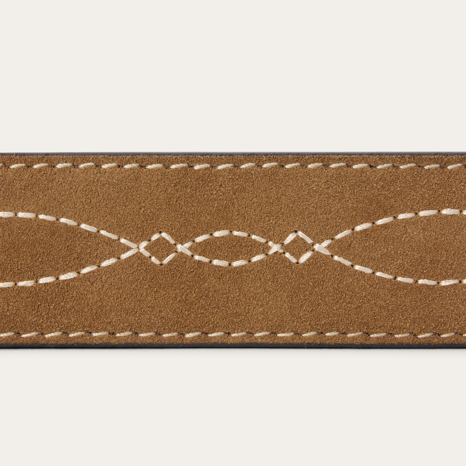 This belt has a 1 ?" wide sand rough-out leather strap with western stitch detail and tapered 1" tooled, top-grain brown leather tabs. It features five holes on the point end to ensure a proper fit for all body types and is finished with a three-piece silver-tone It buckle set. At once rugged and refined, each of our belts embodies our legendary commitment to quality and attention to detail.
