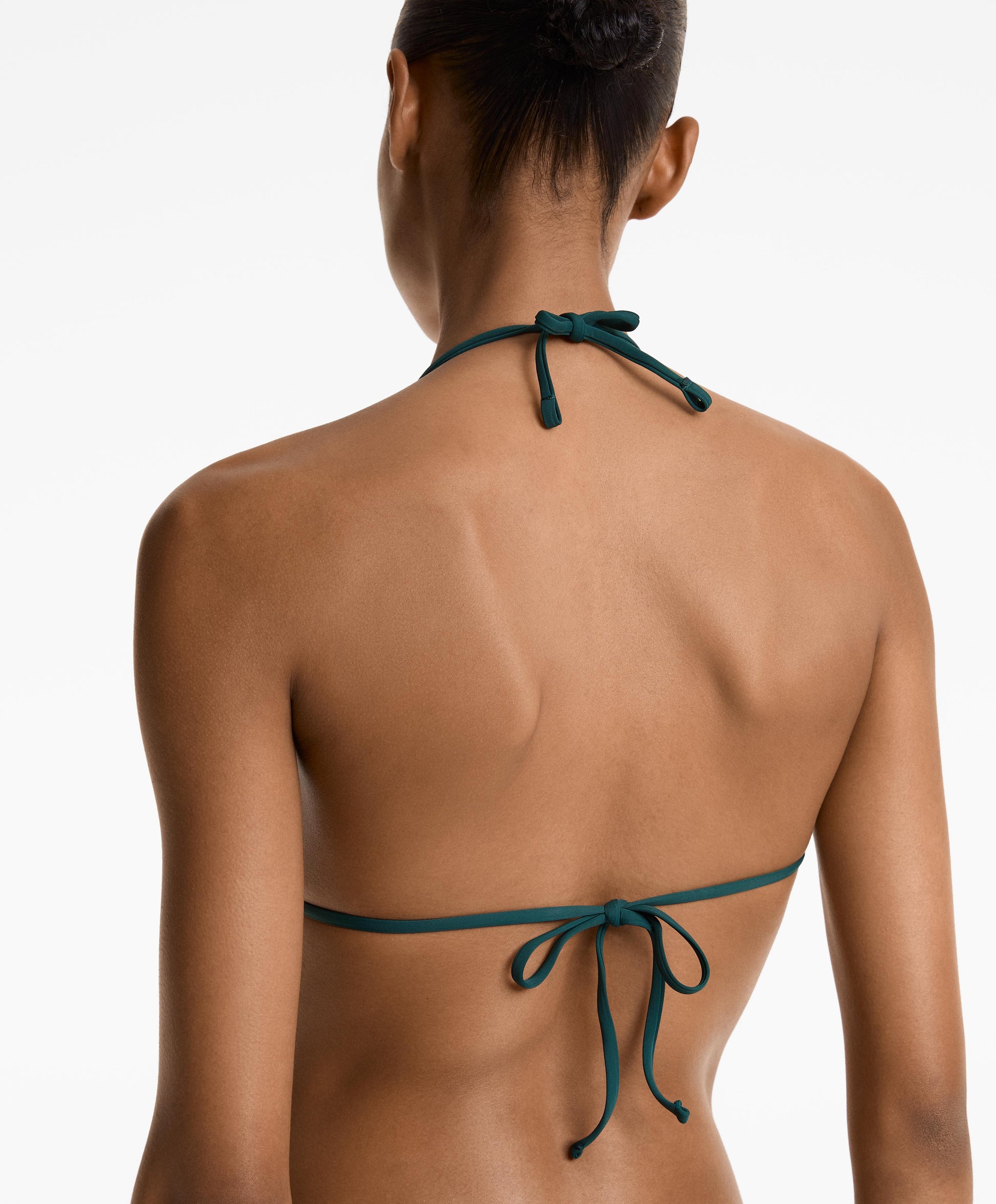 Ref. 0712/456/543 Triangle bikini top with adjustable coverage, non-wired and with removable cups. Thin straps and ties at the back. Crochet fabric with stripes. Beaded detail at the neckline.Materials and care instructions