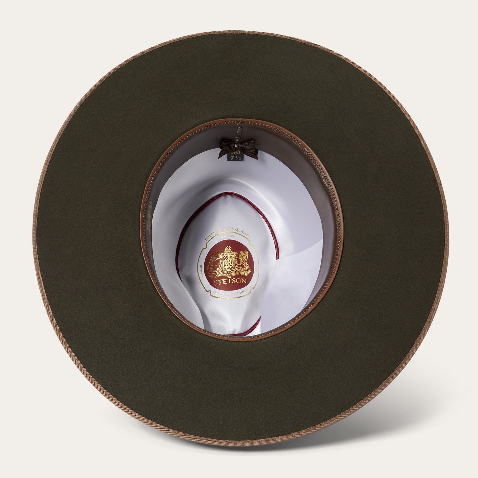 This stylish fedora is constructed of firm Royal Deluxe quality fur felt and features a striking, modern profile. The classic center dent crown is paired with a relatively wide 3 3/4" bound edge flat brim and features a wide grosgrain hat band. Fully-lined, it has a genuine cowhide sweatband and ships in a It hat box.