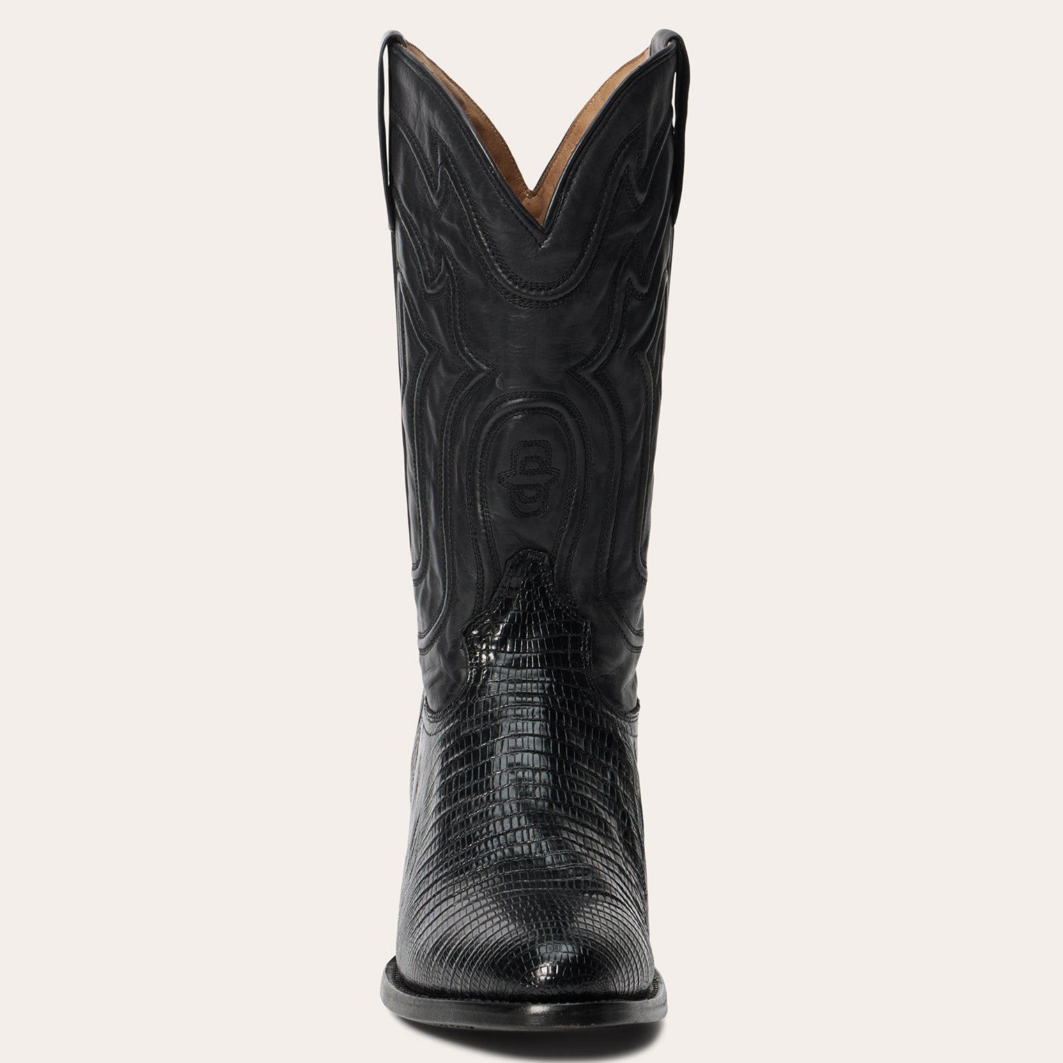 The Wayne Teju Boot combines a traditional western silhouette with statement-making exotic materials. It features a genuine teju vamp and a 13" leather corded shaft and features an R toe-a classic all-purpose style that also dresses up well-as well as a stacked leather cowboy heel. Its quality construction includes 3?4 welt soles, brass nails and handmade lemonwood pegs that will expand and contract with any moisture the boot may encounter. Premium leather lining and a removable Tru-X insole ensure comfort in every step.