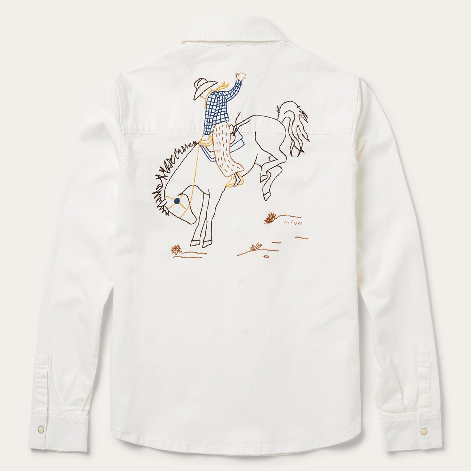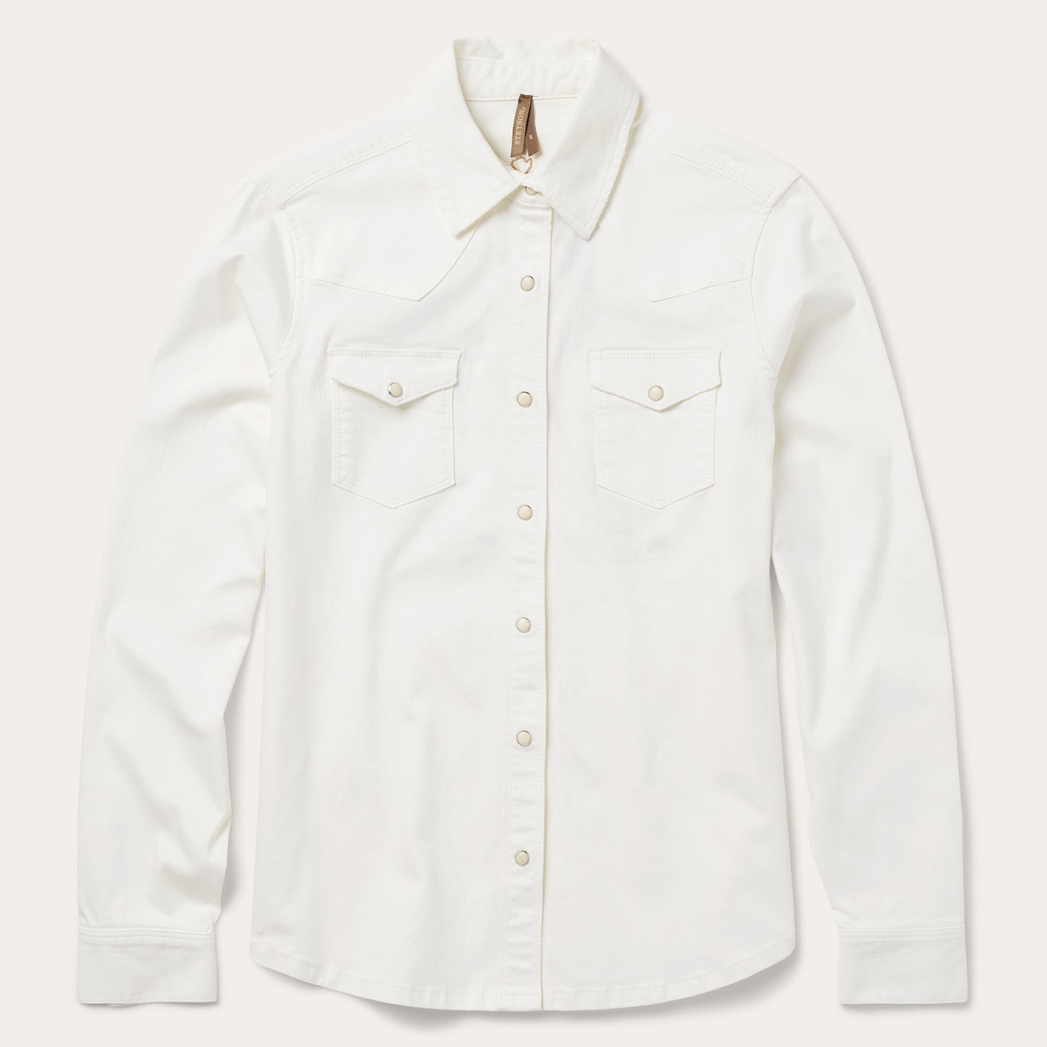 This snap front denim shirt makes a statement with its rich cream color and stunning Western-inspired embroidery. Crafted in a comfortable, flattering boyfriend fit (with just a bit of stretch), it features a single point front yoke, a straight back yoke, single point pockets with flaps and snap closures and a single snap cuff.